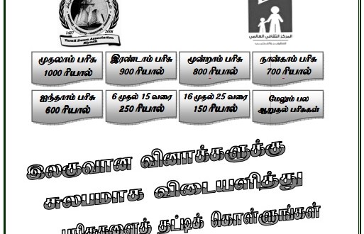 Tamil Dawa Association, Riyadh ஆதரவில் புனித ரமலானை முன்னிட்டு நடத்தப்படும் கல்வி, கலாச்சாரப் போட்டிக்கான கேள்வித்தாள் இத்துடன் இணைக்கப்பட்டுள்ளது விரும்பியவர்கள் பதிவிறக்கம் செய்து அதிலிருந்து பயன் பெருமாறு கேட்டுக்கொள்கிறோம்…