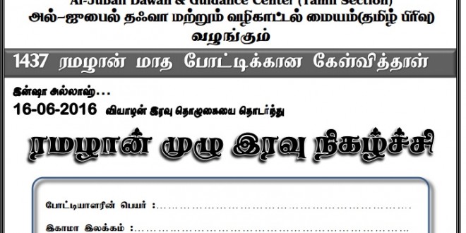 அல் ஜுபைல் தஃவா நிலையம் தமிழ் பிரிவு சார்பாக நடை  பெற இருக்கும் ரமழான் மாத போட்டிக்கான வினாத்தாள் மற்றும் விடைக்கான புத்தகம் இத்துடன் இணைக்கப் பட்டுள்ளன.