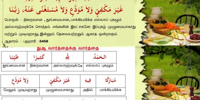 அல்ஹம்து லில்லாஹி கثஸீரன் தய்யிபன் முபாரகன் ஃபீஹி, ஃகைர மக்ஃபிய்யின் வலா முவத்தஇன் வலா முஸ்தஃக்னன் அன்ஹு ரப்பனா.
