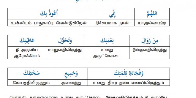 அல்லாஹும்ம இன்னீ அவூது பிக மின் ஜவாலி நிஃமதிக, வ தஹவ்வுலி ஆஃபியதிக,