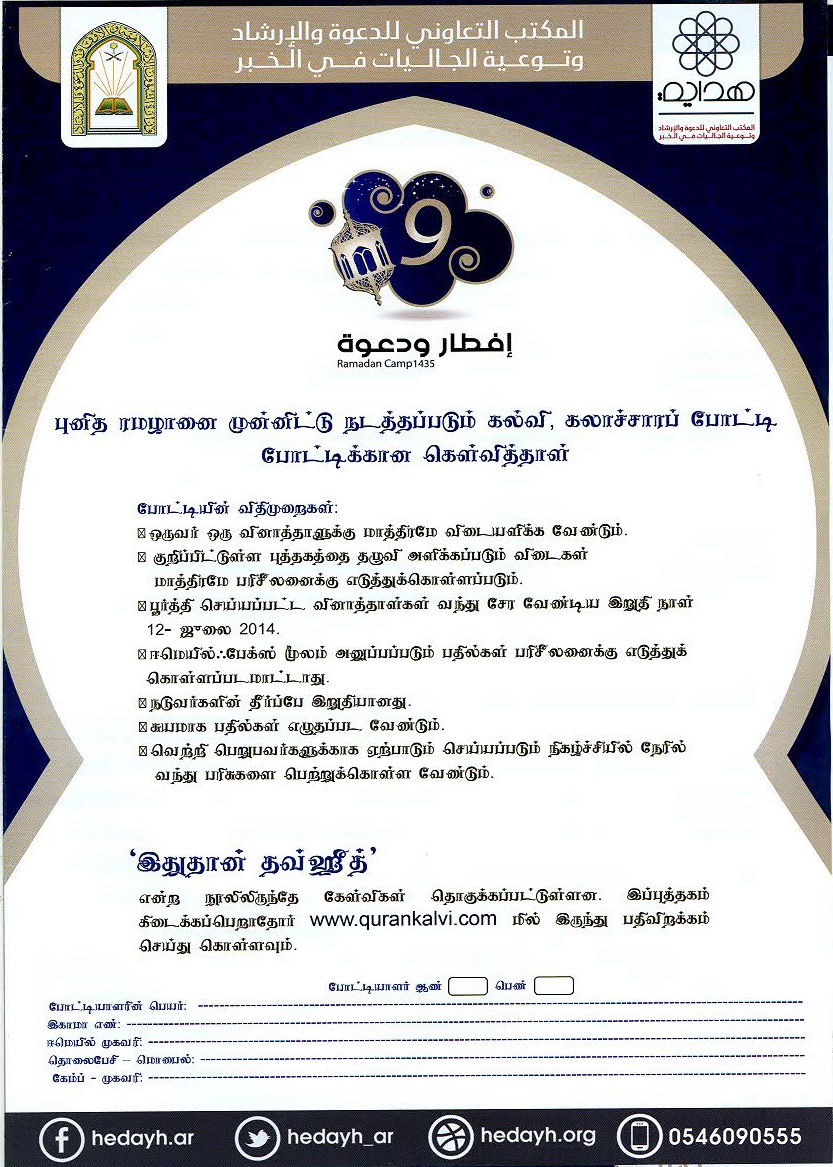 அல்- கோபர் இஸ்லாமிய தாஃவா நிலையத்தின் ஆதரவில் புனித ரமலானை முன்னிட்டு நடத்தப்படும் கல்வி, கலாச்சாரப் போட்டிக்கான கேள்வித்தாள் மற்றும் கேள்விகள் தொகுக்கப்பட்ட “இதுதான் தவ்ஹீத்” என்ற புத்தகமும் இத்துடன் இணைக்கப்பட்டுள்ளது விரும்பியவர்கள் பதிவிறக்கம் செய்து அதிலிருந்து பயன் பெரும்மாறு கேட்டுக்கொள்கிறோம்…