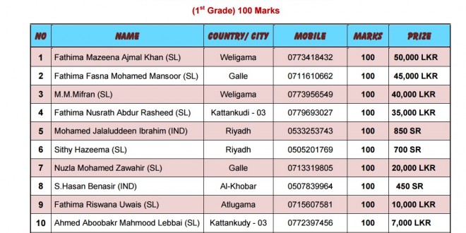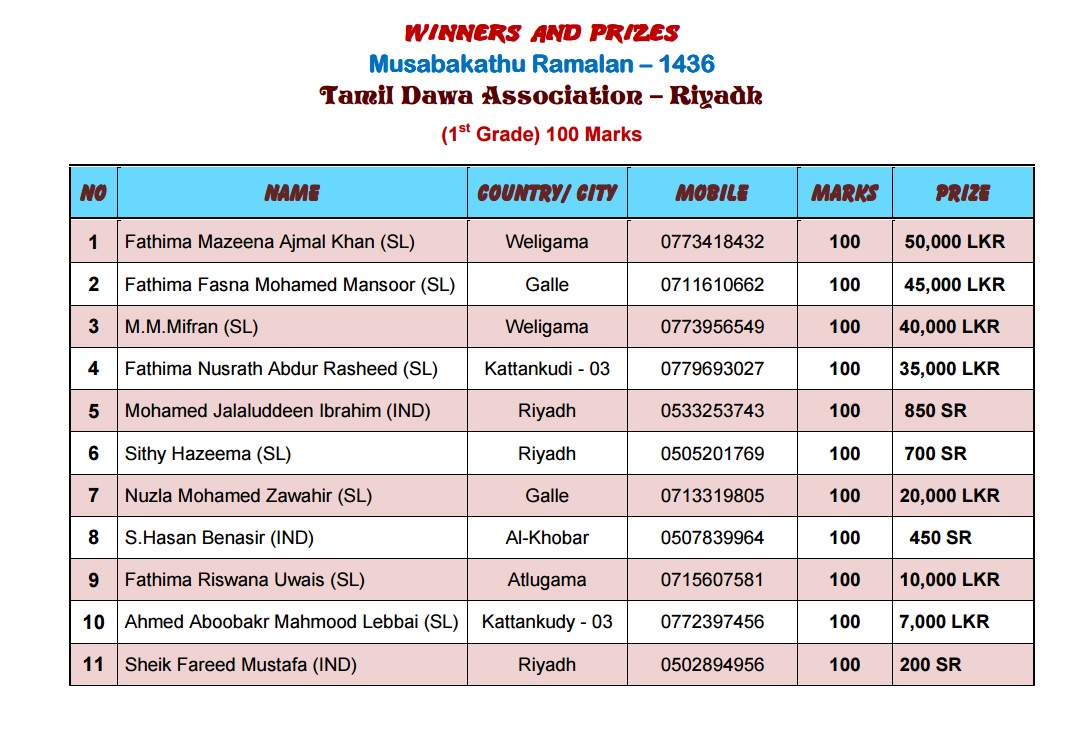 முஸாபகது ரமழான்” புனித ரமலானை முன்னிட்டு நடத்தப்பட்ட போட்டியில் வெற்றிப் பெற்றவர்களின் பெயர் பட்டியல் மற்றும் பரிசின் விபரங்கள்