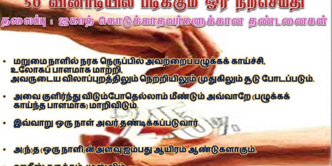 50 வினாடியில் படிக்கும் ஓர் நற்செய்தி – தலைப்பு : ஜகாத் கொடுக்காதவர்களுக்கான தண்டனைகள் March 1, 2017 கட்டுரைகள், ஜகாத் / ஸதக்கா Leave a comment 2,406 Views Share Facebook Twitter