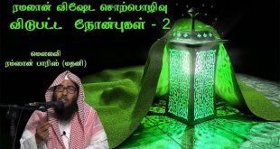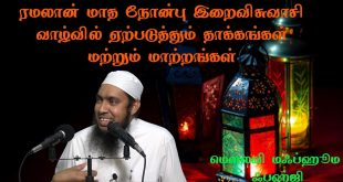 தலைப்பு: ரமலான் மாத நோன்பு இறைவிசுவாசி வாழ்வில் ஏற்படுத்தும் தாக்கங்கள் மற்றும் மாற்றங்கள் வழங்குபவர்: மௌலவி மஃப்ஹூம் ஃபஹ்ஜி நாள்: 19-05-2017 (வெள்ளிகிழமை) இடம்: ரியாத் மலாஸ் மஸ்ஜிதுல் சுலைமான் அல் தஹ்ஹீல்