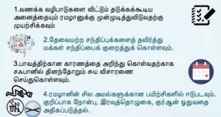 ரமலான் மாதத்திற்கு தயாராகும் சில வழிமுறைகள்.. அரபு மூலம் : Dr. உமர் அல்முக்பில் , மொழிபெயர்ப்பு : மௌலவி அல் ஹாபிள் அப்துல்லாஹ் உவைஸ், ரியாத். 1. வணக்க வழிபாடுகளை விட்டும் தடுக்கக்கூடிய அனைத்தையும் ரமலானுக்கு முன் முடிதுவிடுவதற்கு முயற்சிக்கவும். 2. தேவையேற்ற சந்திப்புகளைத் தவிர்த்து மக்கள் சந்திப்பைக் குறைத்துக் கொள்ளவும். 3. பாவத்திற்கான காரணத்தை அறிந்து கொள்வதற்காக ஷாபானில் தினந்தோறும் சுய விசாரணை செய்துகொள்ளவும். 4. …