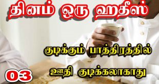 தினம் ஒரு ஹதீஸ் 03: குடிக்கும் பாத்திரத்தில் ஊதி குடிக்கலாகாது! மௌலவி பக்ரூதீன் இம்தாதி குடிக்கும் பாத்திரத்தில் ஊதி குடிக்கலாகாது! وعن ابن عباس رضي اللَّه عنهما أن النَّبيّ ﷺ نَهَى أَن يُتنَفَّسَ في الإِنَاءِ، أَوْ يُنْفَخَ فِيهِ، அறிவிப்பவர் :இப்னு அப்பாஸ் (ரலி) ஆதாரம் :திர்மிதி-1888