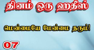 தினம் ஒரு ஹதீஸ் 07: மென்மையே மேன்மை தரும்! மௌலவி பக்ரூதீன் இம்தாதி وعن عائشة رضي الله عنها: أَن النبيَّ ﷺ قَالَ إِنَّ الرِّفقَ لا يَكُونُ في شيءٍ إِلَّا زَانَهُ، وَلا يُنْزَعُ مِنْ شَيءٍ إِلَّا شَانَهُ رواه مسلم. அறிவிப்பாளர்:ஆயிஷா(ரலி) நூல்:முஸ்லிம் 2594