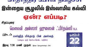 அல் கோபார் இஸ்லாமிய அழைப்பு மற்றும் வழிகாட்டல் நிலையம் சார்பாக நடைபெற்ற இஸ்லாமிய பண்பாட்டியல் மாநாடு ஆசிரியர்: மௌலவி முஹம்மது அஸ்ஹர் ஸீலானி – அழைப்பாளர், அல் கோபார் தவா நிலையம் நாள்: வெள்ளிக்கிழமை மதியம் 3.30 முதல் இரவு 7.00 வரை இடம்: மஸ்ஜித் அல் புஹாரி, அல் அக்ரபியா, அல் கோபார், சவூதி அரேபியா.