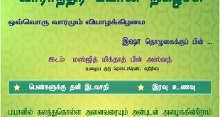 படைப்புகளில் சிறந்தவள் பெண் – ஒருநாள் பெண்கள் மாநாடு, நேரடி ஒளிபரப்பு செய்யப்படும் நேரம் காலை (இந்திய நேரம்) 10:00 – 11:00 மதியம் 12:00 – 12:45 மாலை 3:00 – 6:00 மணிவரை… தலைப்புக்கள் – மருமையில் பெண் – இஸ்லாமிய பார்வையில் இளம்பெண்கள்– படைப்புகளில் சிறந்தவள் பெண்… இந்நிகழ்ச்சியில் உரையாற்றுபவர்கள்- மௌலவி ரஹ்மத்துல்லாஹ் ஃபிர்தௌஸி , மௌலவி இக்பால் ஃபிர்தௌஸி, மௌலவி உமர் அலி ஃபிர்தௌஸி, …