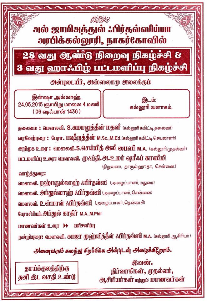 இடம் : கல்லூரி வளாகம், அல் ஜாமிஅத்துல் ஃபிர்தௌசியா அரபி கல்லூரி, நாகர்கோயில்.