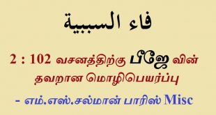 Read Only / அகீதா – தவ்ஹீத் PDFஅகீதா – தவ்ஹீத் PDF அகீதா – தவ்ஹீத் PDF(Download) 2 : 102 வசனத்தில் ஃப ஸப்பிய்யா என்பது சரியா? பிஜே அவர்களின் தவறான மொழிபெயர்ப்பு ———————————————————————————– சூனியத்தை மறுக்க்க்கூடியவர்கள் தங்களுக்கு பொருத்தமாக வசனத்தை மட்டுமல்லாமல் இலக்கணத்தையும் மாற்றிக்கொண்டார்கள். விளைவு அல்லாஹ் அதையும் பொய் என்று வெளிப்படுத்தியுள்ளான். இலக்கண விதி ————————— تأتي الفاء للسببية الناصبة للفعل المضارع …