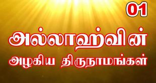 01: அல்லாஹ்வின் அழகிய திருநாமங்கள் மௌலவி பக்ரூதீன் இம்தாதி اللَّهُ لَا إِلَٰهَ إِلَّا هُوَ الْحَيُّ الْقَيُّومُ اللَّهُ – அல்லாஹ் வணங்கப்படக்கூடியவன் الإله – அல்இலாஹ் வணங்கப்படக்கூடயவன் الْحَيُّ – அல்ஹய்யு என்றும் உயிருடன் இருப்பவன் الْقَيُّومُ – அல்கய்யூம் என்றும் நிலைத்திருப்பவன் الْحَمْدُ لِلَّهِ رَبِّ الْعَالَمِينَ (2) الرَّحْمَنِ الرَّحِي الرَّبُّ – அர்ரப்பு அகிலத்தாரைப் படைத்து பரிபாலிப்பவன் الرَّحْمَنِ- அரரஹ்மான் அளவற்ற அருளாளன் …
