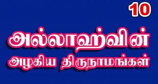 10: அல்லாஹ்வின் அழகிய திருநாமங்கள் மௌலவி பக்ரூதீன் இம்தாதி التواب அத்தவ்வாப் – மிக்க மன்னிப்பவன் اِنَّهٗ هُوَ التَّوَّابُ الرَّحِيْمُ 2:37 الفتاح அல்பத்தாஹ் – சிறந்த தீர்ப்பாளன் وَهُوَ الْـفَتَّاحُ الْعَلِيْمُ (34:26) الرءوف அர்ரஊப் – கருணையாளன் وَاَنَّ اللّٰهَ رَءُوْفٌ رَّحِيْمٌ (24:20) النور அந்நூர் – பிரகாசமாவான் اَللّٰهُ نُوْرُ السَّمٰوٰتِ وَالْاَرْضِ ( 24:35) المقيت அல்முகீத் – கண்காணிப்பவன் وَكَانَ …
