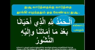 الْـحَمْدُ لِلَّهِ الَّذِي أَحْيَانَا بَعْدَ مَا أمَاتَنَا وإِلَيْهِ النُّشُورُ அல்ஹம்து லில்லாஹி ல்லதீ அஹ்யானா பஃத மா அமாதனா வ இலைஹின் நுஷுர் அல்ஹம்து =எல்லாப் புகழும், லில்லாஹி = அல்லாஹ்வுக்கே, அல்லதீ = அவன் எப்படி ப் பட்டவென்றால், அஹ்யானா = நம்மை உயிர்ப்பித்தான், பஃத= பின்னர், அமாதனா = நம்மை மரணமாக்கினா ன், வ இலைஹின் = அவன் பக்கமே, நுஷுர் =(நாம்) ஒன்று …